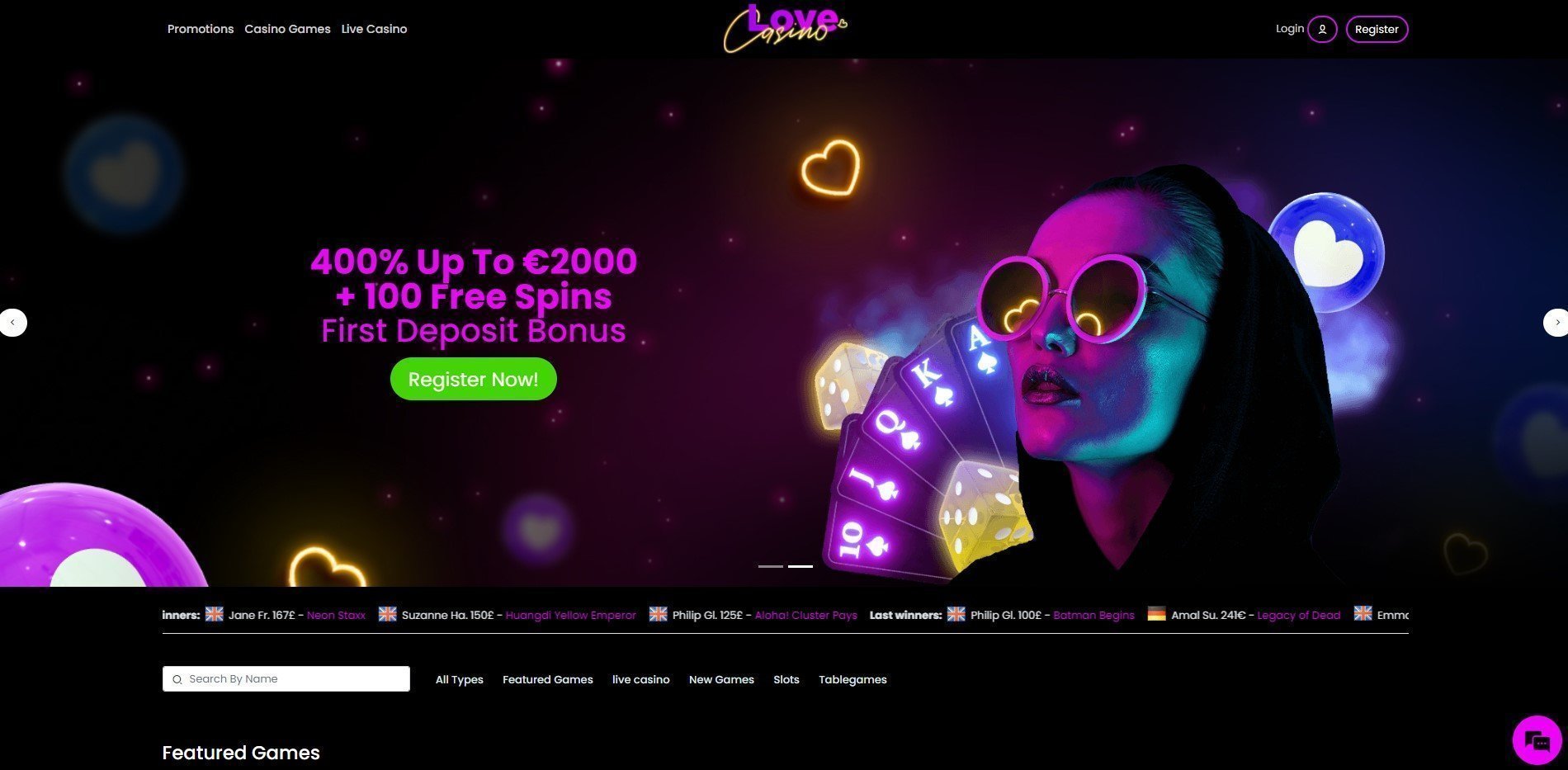 Zusätzlich stehen Ihnen neben den üblichen Tischspielen auch Blackjack, Baccarat und Roulette zur Verfügung. Der Eingangsbereich von Love Casino ist zwar recht schlicht, aber das Angebot wird Ihnen sicherlich gefallen.
